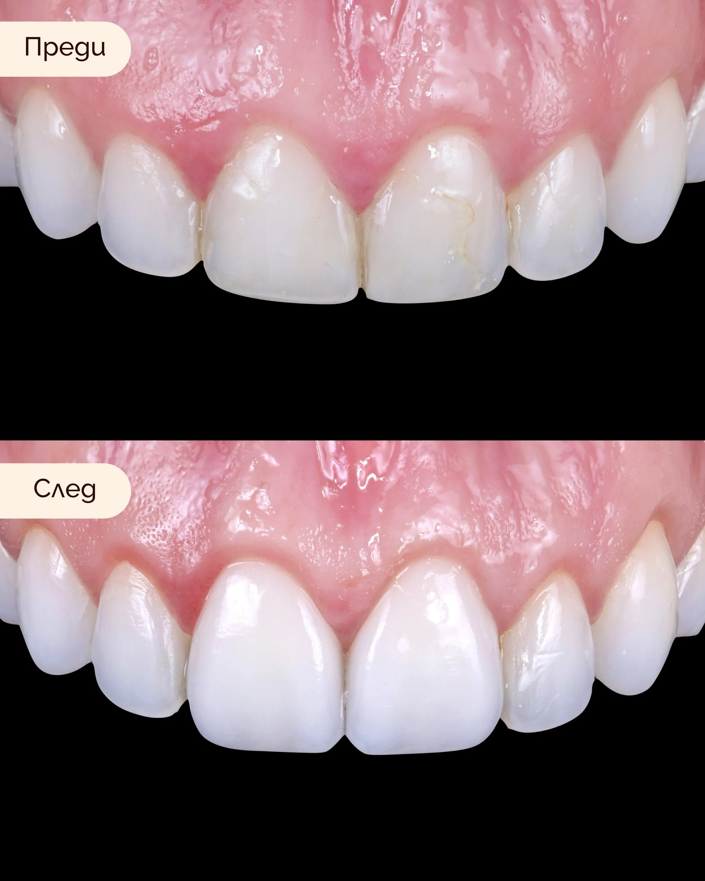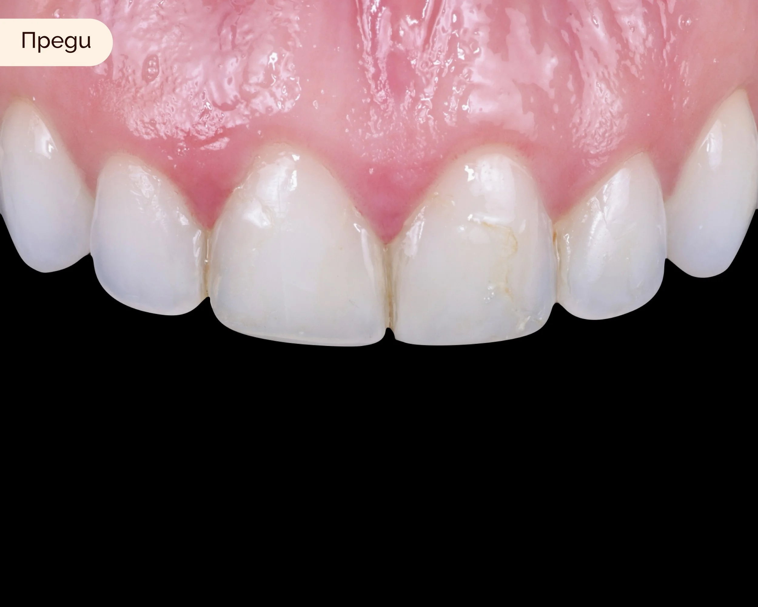 Лечение: Корекция на венеца за удължаване на зъбите и 2 фасети за прикриване на потъмняването и подобряване на формата.